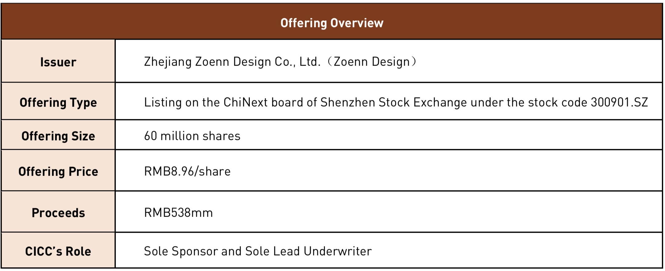 On October 29, 2020, Zhejiang Zoenn Design Co., Ltd. (hereinafter referred to as “Zoenn Design”, or the “Company”, stock code: 300901.SZ) was successfully listed on the ChiNext board of Shenzhen Stock Exchange. CICC acted as Sole Sponsor and Sole Lead Underwriter in this transaction.
